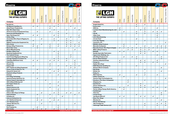 AeroGo Inc. All Material Handling Inc. Allied Power Products Inc. Alps Wire Rope Corp. American Crane & Equipment Corp. American Drill Bushings Co. Apex Tool Group LLC Ashley Sling Associated Wire Rope & Rigging Inc. Ben-Mor Bigfoot Construction Equipment Inc. Bilco Group Bishop Lifting Products Inc. Black Bear Corp. Bloom Manufacturing Bradley Lifting Corp. Bushman Equipment Inc. The Caldwell Group Carol Crane Rigging & Lifting Eng. Chicago Hardware & Fixture Co. Columbus McKinnon Corp. Cone Drive Dinamic Oil Doleco USA DOT Tiedown & Lifting Equipment Downs Crane & Hoist Co. Inc. Edward W. Daniel LLC Elephant Lifting Products Enerpac First Sling Technology General Clamp Industries Inc. Ginnow Equip & Specialty Co. GKS Lifting & Moving LLC Harrington Hoists Inc. Hilman Inc. Hitachi America Ltd. Husky Equipment Inc. Hydra Slide Indusco Wire Rope & Fittings Ingersoll Rand Insulatus Inc. Intercon Enterprises Inc. J. C. Renfroe & Sons Inc. J. D. Neuhaus Corp. Jeamar Winches Inc. Jergens Inc. Ken Forging Inc. Kito Crosby