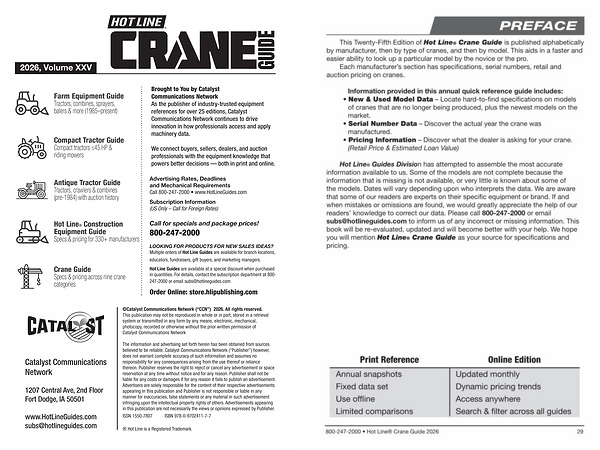 This Twenty-Fifth Edition of Hot Line ® Crane Guide is published alphabetically by manufacturer, then by type of cranes, and then by model. This aids in a faster and easier ability to look up a particular model by the novice or the pro.