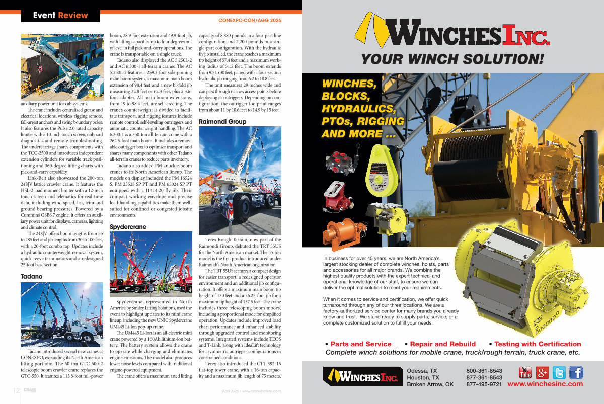 Tadano introduced several new cranes at CONEXPO, expanding its North American lifting portfolio. The 60-ton GTC-600-2 telescopic boom crawler crane replaces the GTC-550. It features a 113.8-foot full-power boom, 28.9-foot extension and 49.9-foot jib, with lifting capacities up to four degrees out of level in full pick-and-carry operations. The crane is transportable on a single truck.