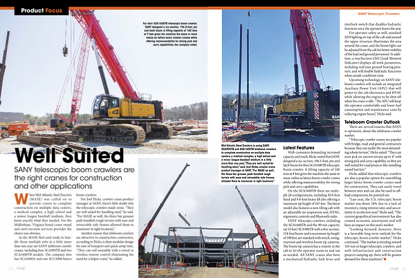 In the MASE fleet and ready to handle those multiple jobs in a little more than one year are SANY teleboom crawler cranes, including four SCA900TB and two SCA1600TB models. The company also has SCA2600A and one SCC3000 lattice boom crawlers.
