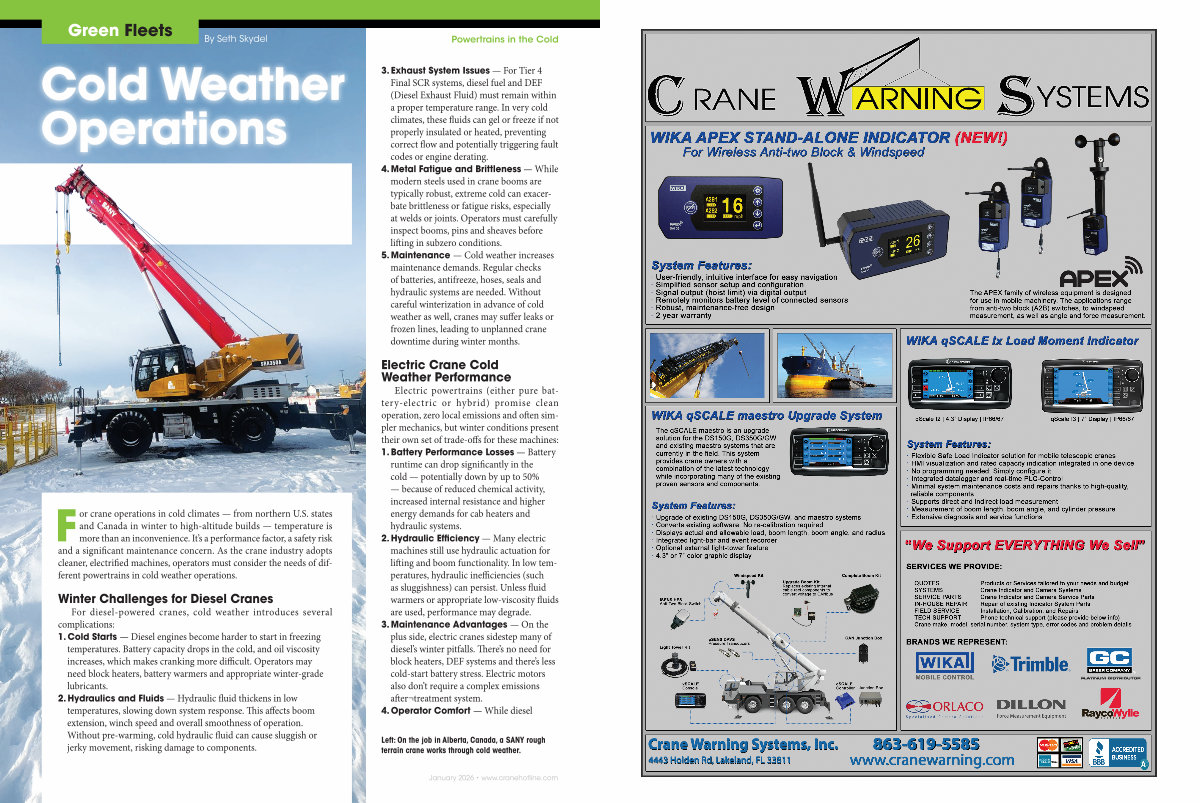 For crane operations in cold climates— from northern U. S. states and Canada in winter to high-altitude builds— temperature is more than an inconvenience. It’ s a performance factor, a safety risk and a significant maintenance concern. As the crane industry adopts cleaner, electrified machines, operators must consider the needs of different powertrains in cold weather operations.