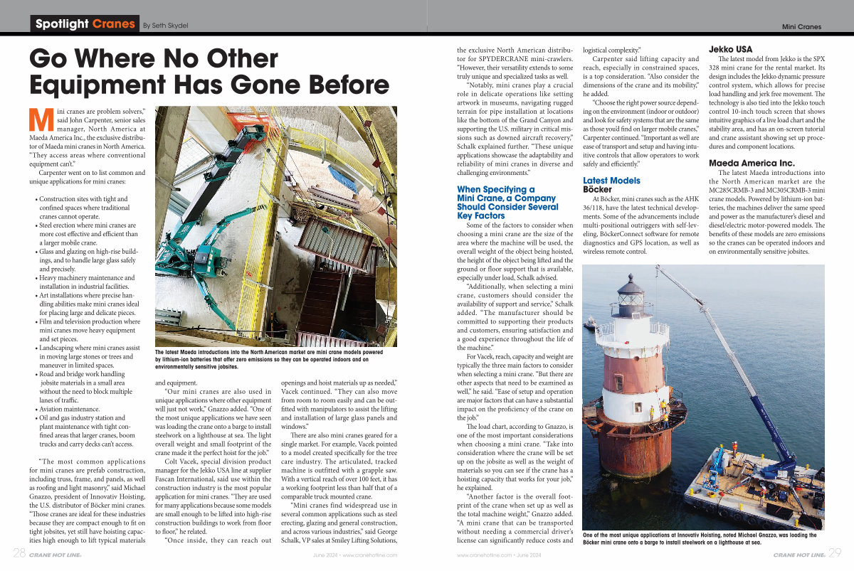 “ Another factor is the overall footprint of the crane when set up as well as the total machine weight,” Gnazzo added.“ A mini crane that can be transported without needing a commercial driver’ s license can significantly reduce costs and logistical complexity.”