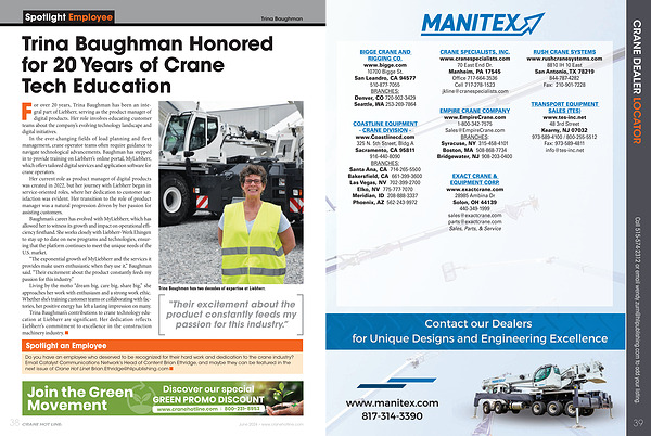 Do you have an employee who deserved to be recognized for their hard work and dedication to the crane industry? Email Catalyst Communications Network’ s Head of Content Brian Ethridge, and maybe they can be featured in the next issue of Crane Hot Line! Brian. Ethridge @ hlipublishing. com