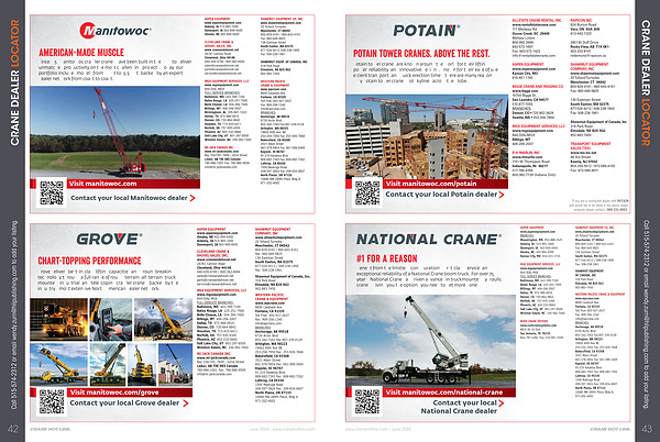 CRANE DEALER LOCATOR Call 515-574-2312 or email wendy. zurn @ hlipublishing. com to add your listing. www. cranehotline. com • June 2024 CRANE HOT LINE ®