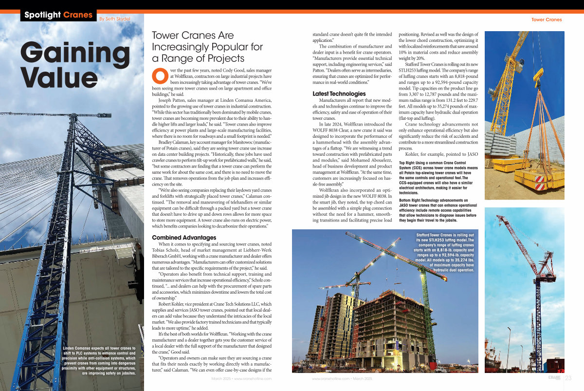 Joseph Patton, sales manager at Linden Comansa America, pointed to the growing use of tower cranes in industrial construction.“ While this sector has traditionally been dominated by mobile cranes, tower cranes are becoming more prevalent due to their ability to handle higher lifts and larger loads,” he said.“ Tower cranes also improve efficiency at power plants and large-scale manufacturing facilities, where there is no room for roadways and a small footprint is needed.”
