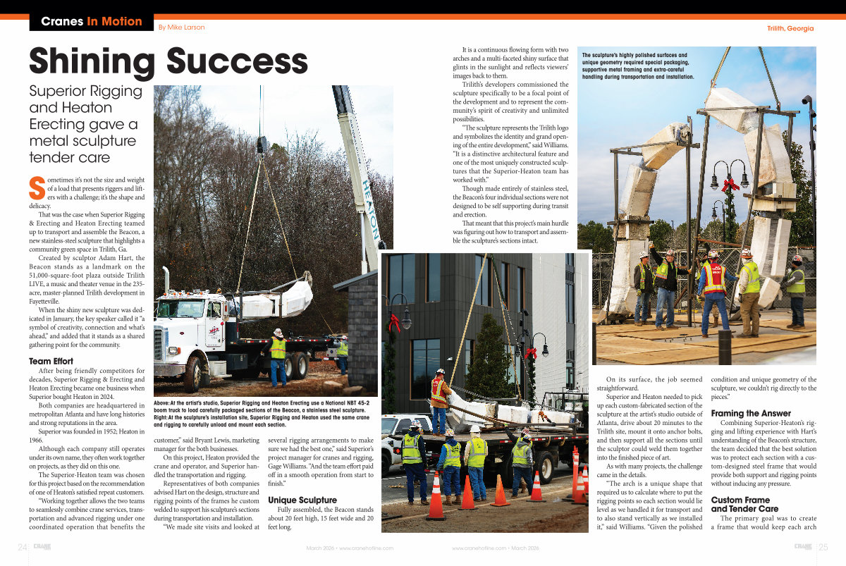 That was the case when Superior Rigging & Erecting and Heaton Erecting teamed up to transport and assemble the Beacon, a new stainless-steel sculpture that highlights a community green space in Trilith, Ga.