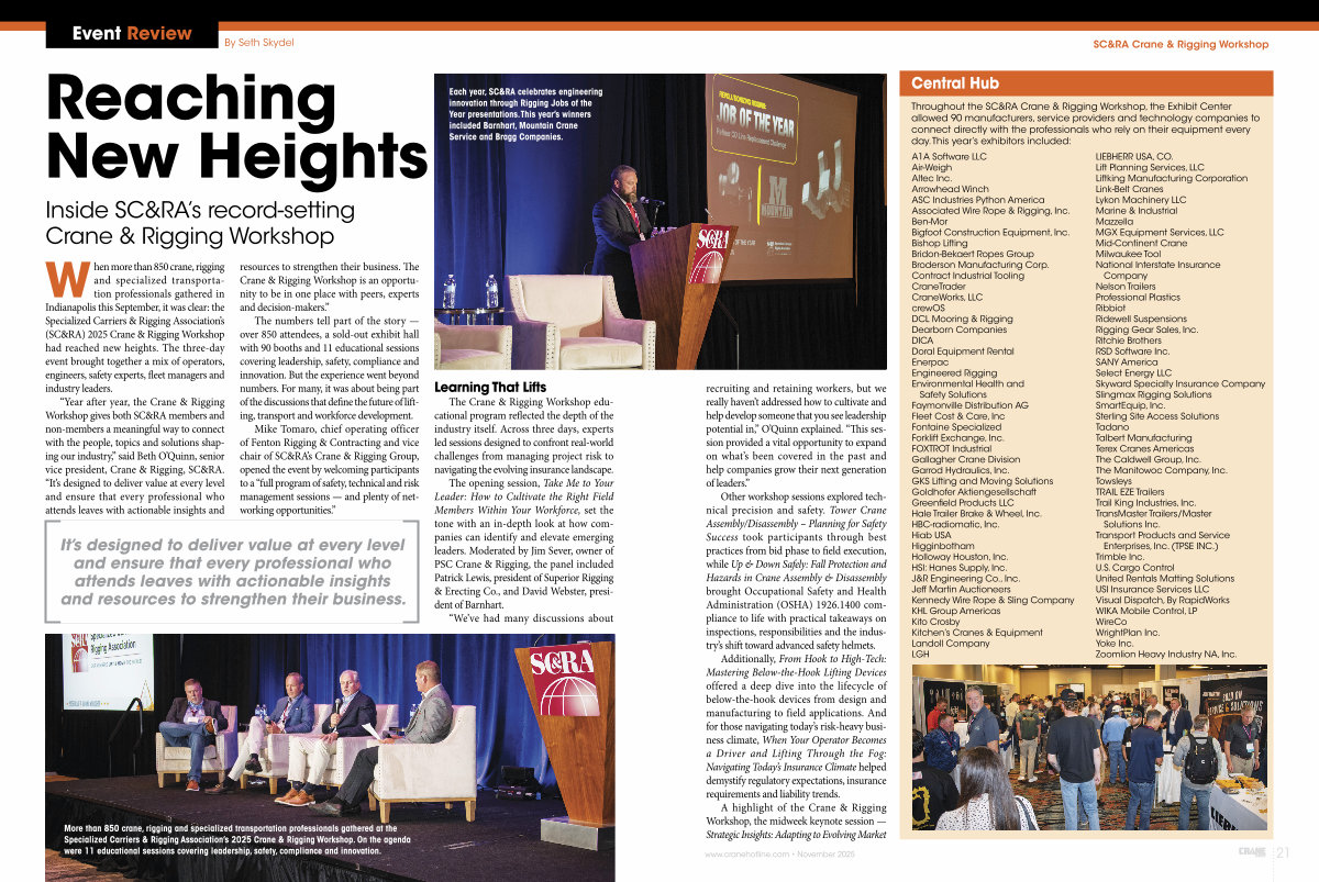 When more than 850 crane, rigging and specialized transportation professionals gathered in Indianapolis this September, it was clear: the Specialized Carriers & Rigging Association’ s( SC & RA) 2025 Crane & Rigging Workshop had reached new heights. The three-day event brought together a mix of operators, engineers, safety experts, fleet managers and industry leaders.
