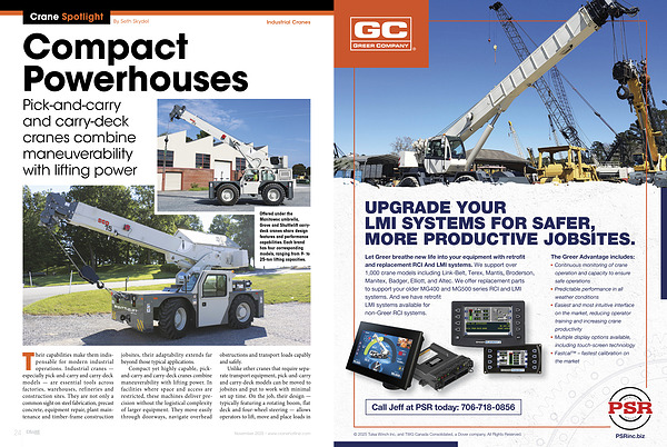 Compact yet highly capable, pickand-carry and carry-deck cranes combine maneuverability with lifting power. In facilities where space and access are restricted, these machines deliver precision without the logistical complexity of larger equipment. They move easily through doorways, navigate overhead obstructions and transport loads capably and safely.